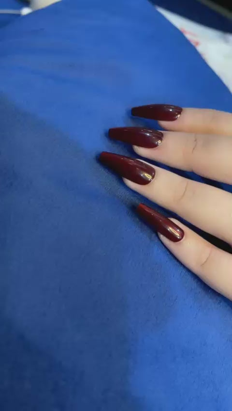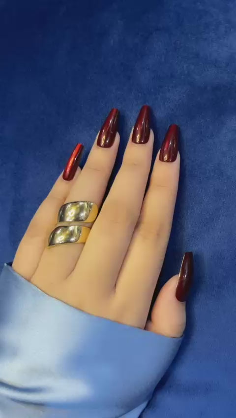 Turn heads with the fiery allure of our Crimson Glaze Cat Eye Coffin Nails. Featuring a deep, magnetic red shimmer that shifts beautifully with the light, these nails exude confidence, power, and pure glamour. Perfect for parties, festive looks, or romantic nights, they add instant sophistication to any outfit.