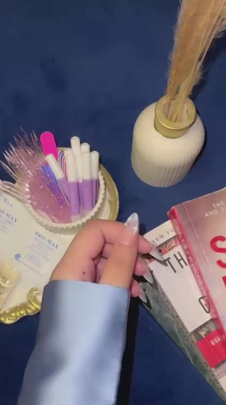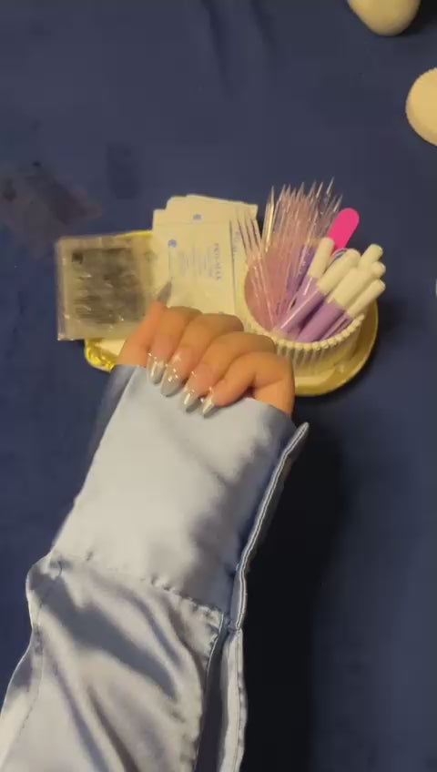 Step into a world of shimmer and magic with our Celestial Pink Dream nails. Designed with a soft pink base fading into a light blue cat-eye ombré, these almond-shaped press-ons sparkle with hand-painted pearl and star details, giving a dreamy, celestial glow to your fingertips.